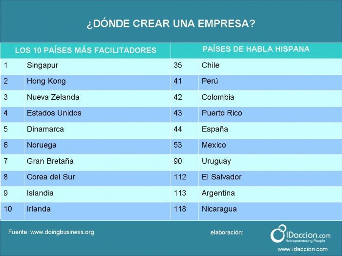 En cuanto a los países latinoamericanos, el informe “Doing Business” otorga las mejores posiciones a Mexico (35) Peru (36), Chile (43) y Puerto Rico (47). Podéis consultar el informe completo aquí. La Tasa de Actividad Emprendedora más elevada se encuentra en Chile (23,7%), seguido de Perú (22,9%) Panamá y Argentina (ambas con un 20,8%)